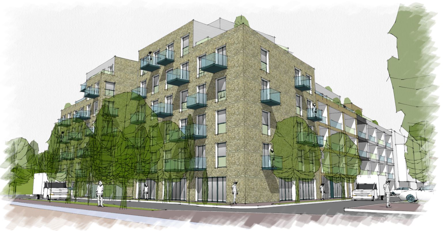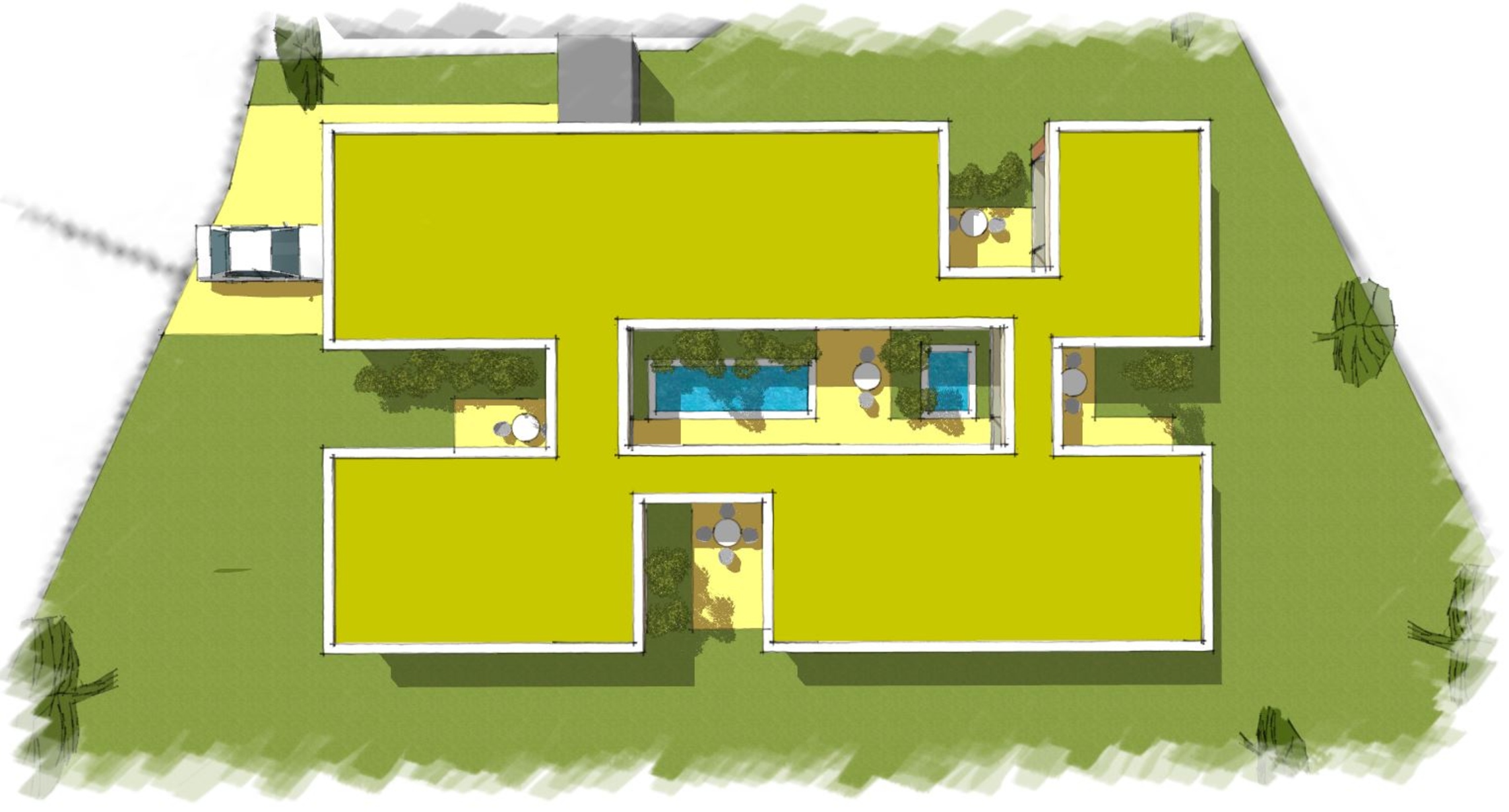 Dostavba volného pozemku proluky je tvořena dvěma objekty, přední uliční a zadní dvorní. Mezi nimi je zelený dvůr s trávou, keři a stromy v kontejnerech. Uliční budova plynule navazuje na přilehlé činžovní domy a má 8 NP, budova dvorní má 6 NP. Dům je určen pro bydlení, kanceláře a obchod.
