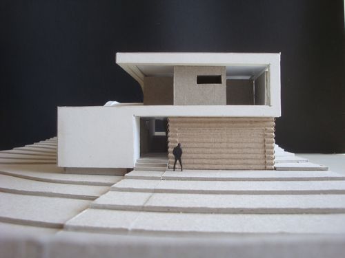 Dům svým zvlněním kopíruje reliéf terénu a využívá výhledů do okolí. Výrazné lemování tvaru domu je řešeno předsazeným obkladem z keramických desek bíle barvy.